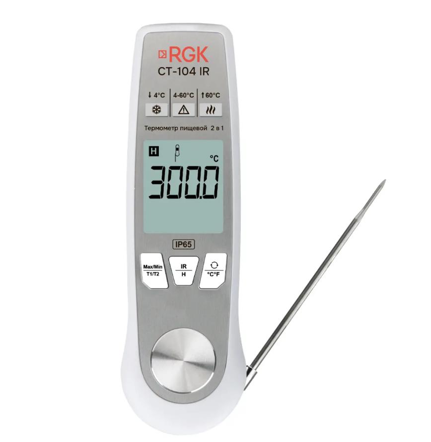 Пищевой термометр RGK CT-104 IR представляет собой комбинированный инструмент, обеспечивающий контроль поверхностной и внутренней температуры продуктов, сырья, полуфабрикатов, а также других целевых объектов, для чего оборудуется инфракрасной системой, реализующей функции пирометра, и погружным зондом. Обладая широким измерительным диапазоном, изделие подходит как для отслеживания условий хранения термолабильной продукции, в том числе замороженной, так и для оценки соблюдения технологии приготовления пищи с применением тепловой обработки. Комбинированный измеритель температуры внесен в Госреестр СИ и может задействоваться в качестве средства оперативного контроля при инспекционных проверках, в ходе экспертиз и для решения других задач, попадающих под государственное регулирование.