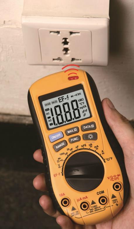 Функции прибора: Бесконтактное определение переменного напряжения в цепи (>50В); Относительные измерения; Удержание показаний на дисплее; Авто / ручной выбор диапазона измерений; Режим тревоги; Подсветка дисплея; Индикатор обратной полярности; Индикатор замены батарей питания; Автоматическое отключение прибора; Индикация перегрузки.